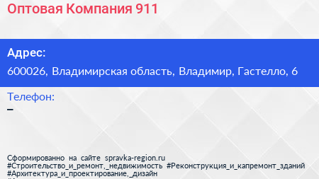 Оптовая Компания 911 по адресу 600026, Владимирская область, Владимир, Гастелло, 6 в дальнейшем Организация, размещена в следующих категориях: