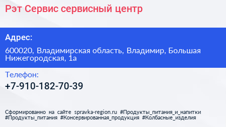 Рэт-Сервис, сервисный центр по адресу 600020, Владимирская область, Владимир, Большая Нижегородская, 1а в дальнейшем Организация, размещена в следующих категориях:
