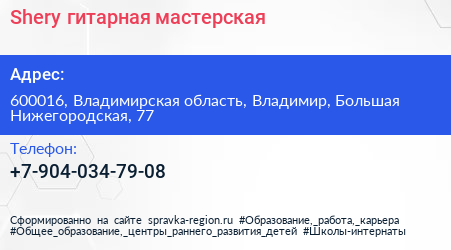 Shery, гитарная мастерская по адресу 600016, Владимирская область, Владимир, Большая Нижегородская, 77 в дальнейшем Организация, размещена в следующих категориях: