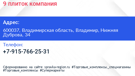 9 плиток, компания по адресу 600037, Владимирская область, Владимир, Нижняя Дуброва, 34 в дальнейшем Организация, размещена в следующих категориях: