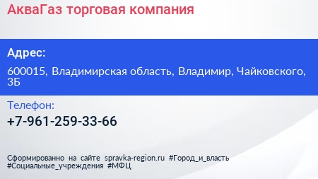 АкваГаз, торговая компания по адресу 600015, Владимирская область, Владимир, Чайковского, 3Б в дальнейшем Организация, размещена в следующих категориях: