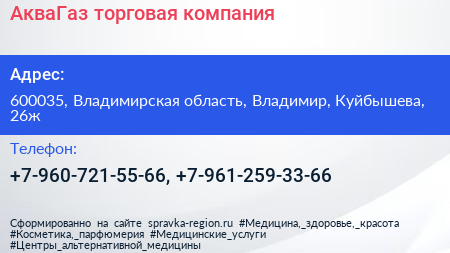 АкваГаз, торговая компания по адресу 600035, Владимирская область, Владимир, Куйбышева, 26ж в дальнейшем Организация, размещена в следующих категориях: