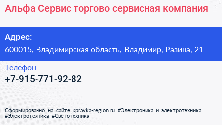 Альфа-Сервис, торгово-сервисная компания по адресу 600015, Владимирская область, Владимир, Разина, 21 в дальнейшем Организация, размещена в следующих категориях: