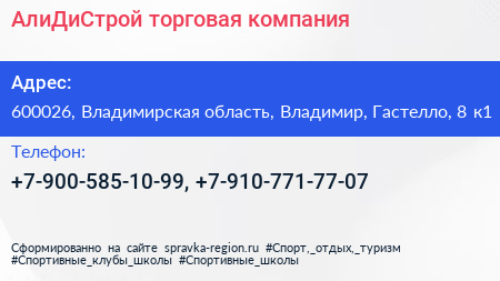 АлиДиСтрой, торговая компания по адресу 600026, Владимирская область, Владимир, Гастелло, 8 к1 в дальнейшем Организация, размещена в следующих категориях: