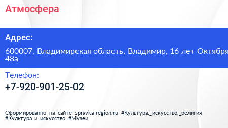 Атмосфера по адресу 600007, Владимирская область, Владимир, 16 лет Октября, 48а в дальнейшем Организация, размещена в следующих категориях: