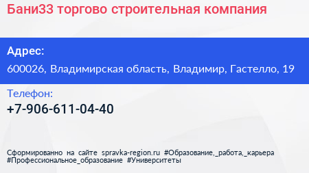 Бани33, торгово-строительная компания по адресу 600026, Владимирская область, Владимир, Гастелло, 19 в дальнейшем Организация, размещена в следующих категориях: