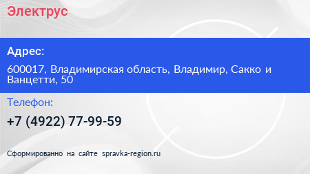 Электрус по адресу 600017, Владимирская область, Владимир, Сакко и Ванцетти, 50 в дальнейшем Организация, размещена в следующих категориях: