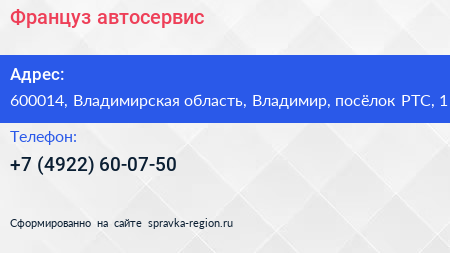 Француз, автосервис по адресу 600014, Владимирская область, Владимир, посёлок РТС, 1 в дальнейшем Организация, размещена в следующих категориях: