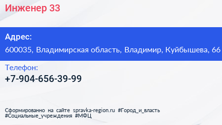 Инженер 33 по адресу 600035, Владимирская область, Владимир, Куйбышева, 66 в дальнейшем Организация, размещена в следующих категориях: