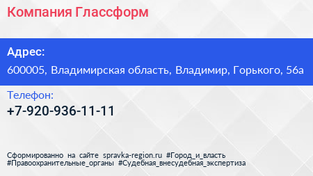 Компания Глассформ по адресу 600005, Владимирская область, Владимир, Горького, 56а в дальнейшем Организация, размещена в следующих категориях: