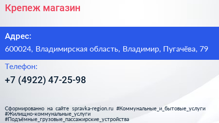 Крепеж, магазин по адресу 600024, Владимирская область, Владимир, Пугачёва, 79 в дальнейшем Организация, размещена в следующих категориях: