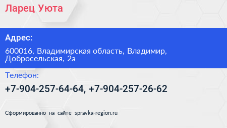 Ларец Уюта по адресу 600016, Владимирская область, Владимир, Добросельская, 2а в дальнейшем Организация, размещена в следующих категориях: