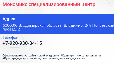 Мономикс, специализированный центр по адресу 600009, Владимирская область, Владимир, 2-й Почаевский проезд, 2 в дальнейшем Организация, размещена в следующих категориях: