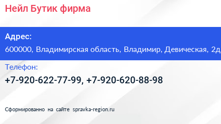 Нейл Бутик, фирма по адресу 600000, Владимирская область, Владимир, Девическая, 2д в дальнейшем Организация, размещена в следующих категориях: