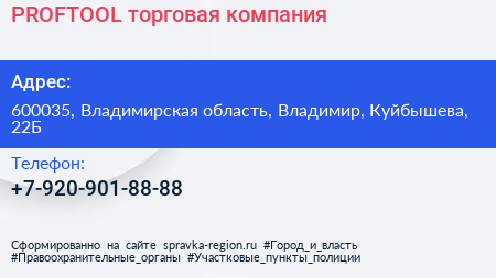 PROFTOOL, торговая компания по адресу 600035, Владимирская область, Владимир, Куйбышева, 22Б в дальнейшем Организация, размещена в следующих категориях: