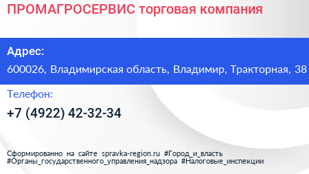 ПРОМАГРОСЕРВИС, торговая компания по адресу 600026, Владимирская область, Владимир, Тракторная, 38 в дальнейшем Организация, размещена в следующих категориях:
