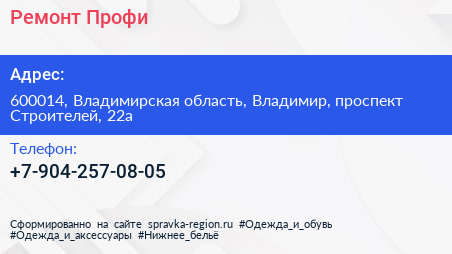 Ремонт-Профи по адресу 600014, Владимирская область, Владимир, проспект Строителей, 22а в дальнейшем Организация, размещена в следующих категориях: