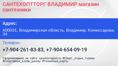 САНТЕХОПТТОРГ-ВЛАДИМИР, магазин сантехники по адресу 600031, Владимирская область, Владимир, Комиссарова, 34 в дальнейшем Организация, размещена в следующих категориях: