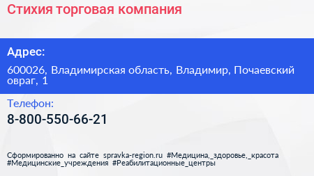 Стихия, торговая компания по адресу 600026, Владимирская область, Владимир, Почаевский овраг, 1 в дальнейшем Организация, размещена в следующих категориях: