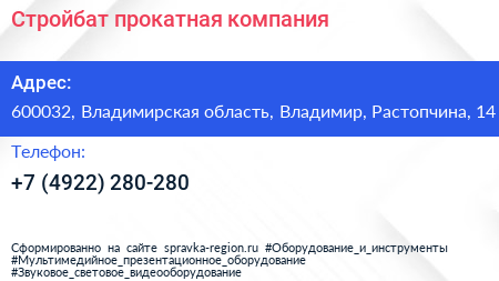 Стройбат, прокатная компания по адресу 600032, Владимирская область, Владимир, Растопчина, 14 в дальнейшем Организация, размещена в следующих категориях: