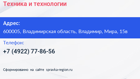 Техника и технологии по адресу 600005, Владимирская область, Владимир, Мира, 15в в дальнейшем Организация, размещена в следующих категориях: