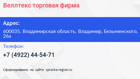 Веллтекс, торговая фирма по адресу 600035, Владимирская область, Владимир, Безыменского, 26а в дальнейшем Организация, размещена в следующих категориях: