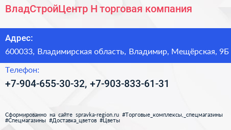 ВладСтройЦентр Н, торговая компания по адресу 600033, Владимирская область, Владимир, Мещёрская, 9Б в дальнейшем Организация, размещена в следующих категориях: