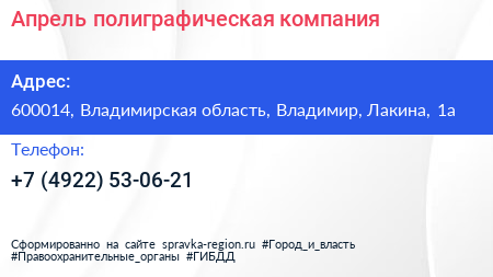 Апрель, полиграфическая компания по адресу 600014, Владимирская область, Владимир, Лакина, 1а в дальнейшем Организация, размещена в следующих категориях: