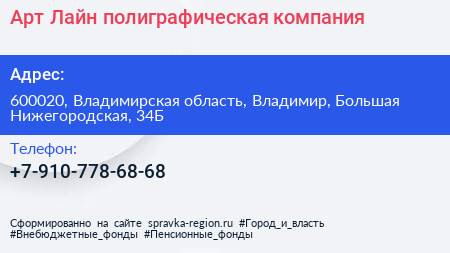 Арт-Лайн, полиграфическая компания по адресу 600020, Владимирская область, Владимир, Большая Нижегородская, 34Б в дальнейшем Организация, размещена в следующих категориях:
