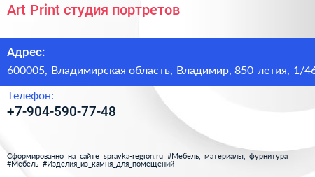 Art Print, студия портретов по адресу 600005, Владимирская область, Владимир, 850-летия, 1/46 в дальнейшем Организация, размещена в следующих категориях: