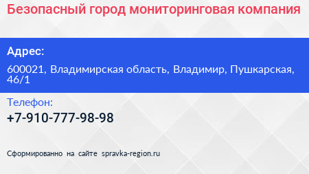 Безопасный город, мониторинговая компания по адресу 600021, Владимирская область, Владимир, Пушкарская, 46/1 в дальнейшем Организация, размещена в следующих категориях: