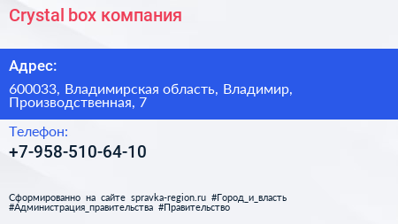 Crystal-box, компания по адресу 600033, Владимирская область, Владимир, Производственная, 7 в дальнейшем Организация, размещена в следующих категориях:
