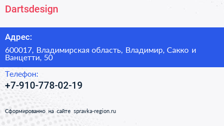 Dartsdesign по адресу 600017, Владимирская область, Владимир, Сакко и Ванцетти, 50 в дальнейшем Организация, размещена в следующих категориях:
