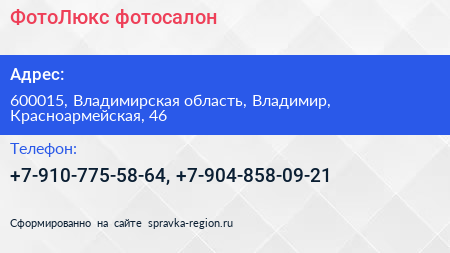 ФотоЛюкс, фотосалон по адресу 600015, Владимирская область, Владимир, Красноармейская, 46 в дальнейшем Организация, размещена в следующих категориях:
