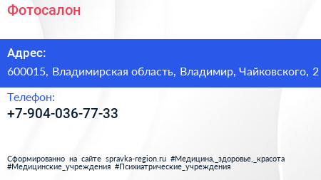 Фотосалон по адресу 600015, Владимирская область, Владимир, Чайковского, 2 в дальнейшем Организация, размещена в следующих категориях: