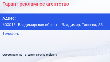 Гарант, рекламное агентство по адресу 600015, Владимирская область, Владимир, Танеева, 38 в дальнейшем Организация, размещена в следующих категориях:
