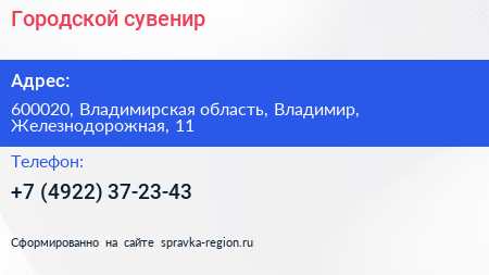 Городской сувенир по адресу 600020, Владимирская область, Владимир, Железнодорожная, 11 в дальнейшем Организация, размещена в следующих категориях: