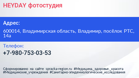 HEYDAY, фотостудия по адресу 600014, Владимирская область, Владимир, посёлок РТС, 14а в дальнейшем Организация, размещена в следующих категориях: