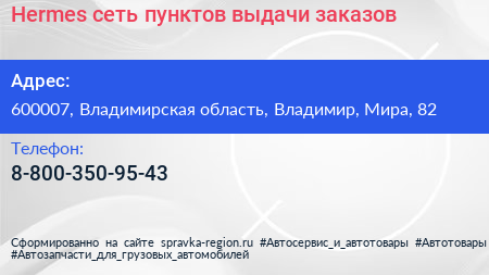 Hermes, сеть пунктов выдачи заказов по адресу 600007, Владимирская область, Владимир, Мира, 82 в дальнейшем Организация, размещена в следующих категориях: