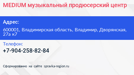 MEDIUM, музыкальный продюсерский центр по адресу 600001, Владимирская область, Владимир, Дворянская, 27а к7 в дальнейшем Организация, размещена в следующих категориях: