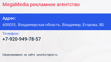 MegaMedia, рекламное агентство по адресу 600031, Владимирская область, Владимир, Егорова, 8Б в дальнейшем Организация, размещена в следующих категориях: