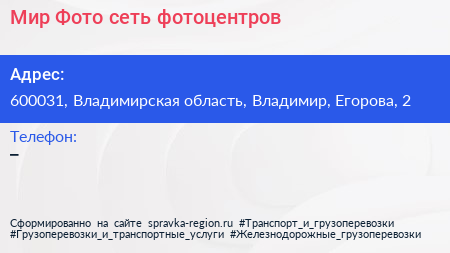 Мир Фото, сеть фотоцентров по адресу 600031, Владимирская область, Владимир, Егорова, 2 в дальнейшем Организация, размещена в следующих категориях: