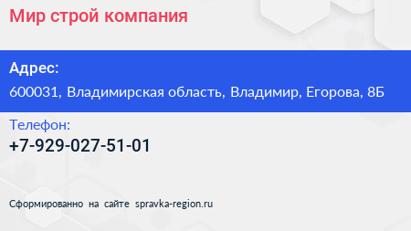 Мир строй, компания по адресу 600031, Владимирская область, Владимир, Егорова, 8Б в дальнейшем Организация, размещена в следующих категориях: