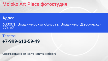 Moloko Art Place, фотостудия по адресу 600001, Владимирская область, Владимир, Дворянская, 27а к7 в дальнейшем Организация, размещена в следующих категориях: