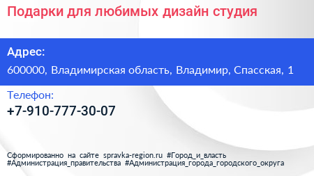 Подарки для любимых, дизайн-студия по адресу 600000, Владимирская область, Владимир, Спасская, 1 в дальнейшем Организация, размещена в следующих категориях: