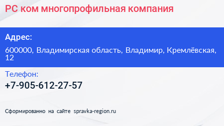 РС-ком, многопрофильная компания по адресу 600000, Владимирская область, Владимир, Кремлёвская, 12 в дальнейшем Организация, размещена в следующих категориях: