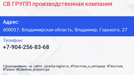 СВ-ГРУПП, производственная компания по адресу 600017, Владимирская область, Владимир, Горького, 27 в дальнейшем Организация, размещена в следующих категориях: