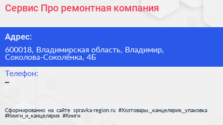 Сервис Про, ремонтная компания по адресу 600018, Владимирская область, Владимир, Соколова-Соколёнка, 4Б в дальнейшем Организация, размещена в следующих категориях: