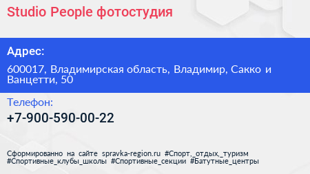 Studio People, фотостудия по адресу 600017, Владимирская область, Владимир, Сакко и Ванцетти, 50 в дальнейшем Организация, размещена в следующих категориях: