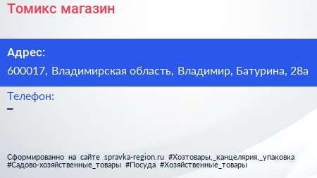 Томикс, магазин по адресу 600017, Владимирская область, Владимир, Батурина, 28а в дальнейшем Организация, размещена в следующих категориях: